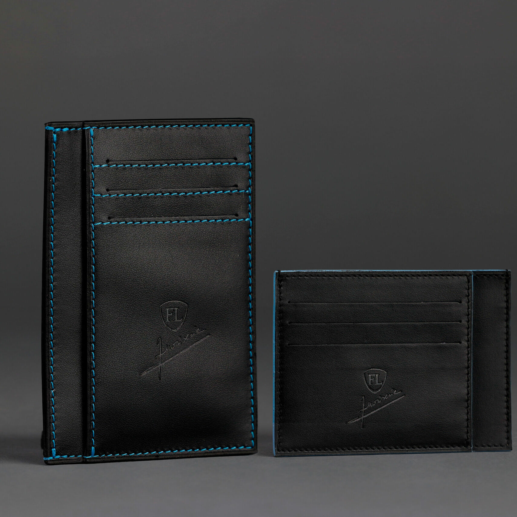 Made of premium black leather, with contrasting blue trim, they evoke the perfect balance between sportiness and luxury. The FL Fuoriserie logo hot-stamped on the front is a hallmark of craftsmanship. The extreme thinness (only 0.2 cm thick) ensures a minimum footprint, like a carbon fiber frame designed to maximize efficiency and performance. Perfect for those who want a refined style, without compromise on functionality.